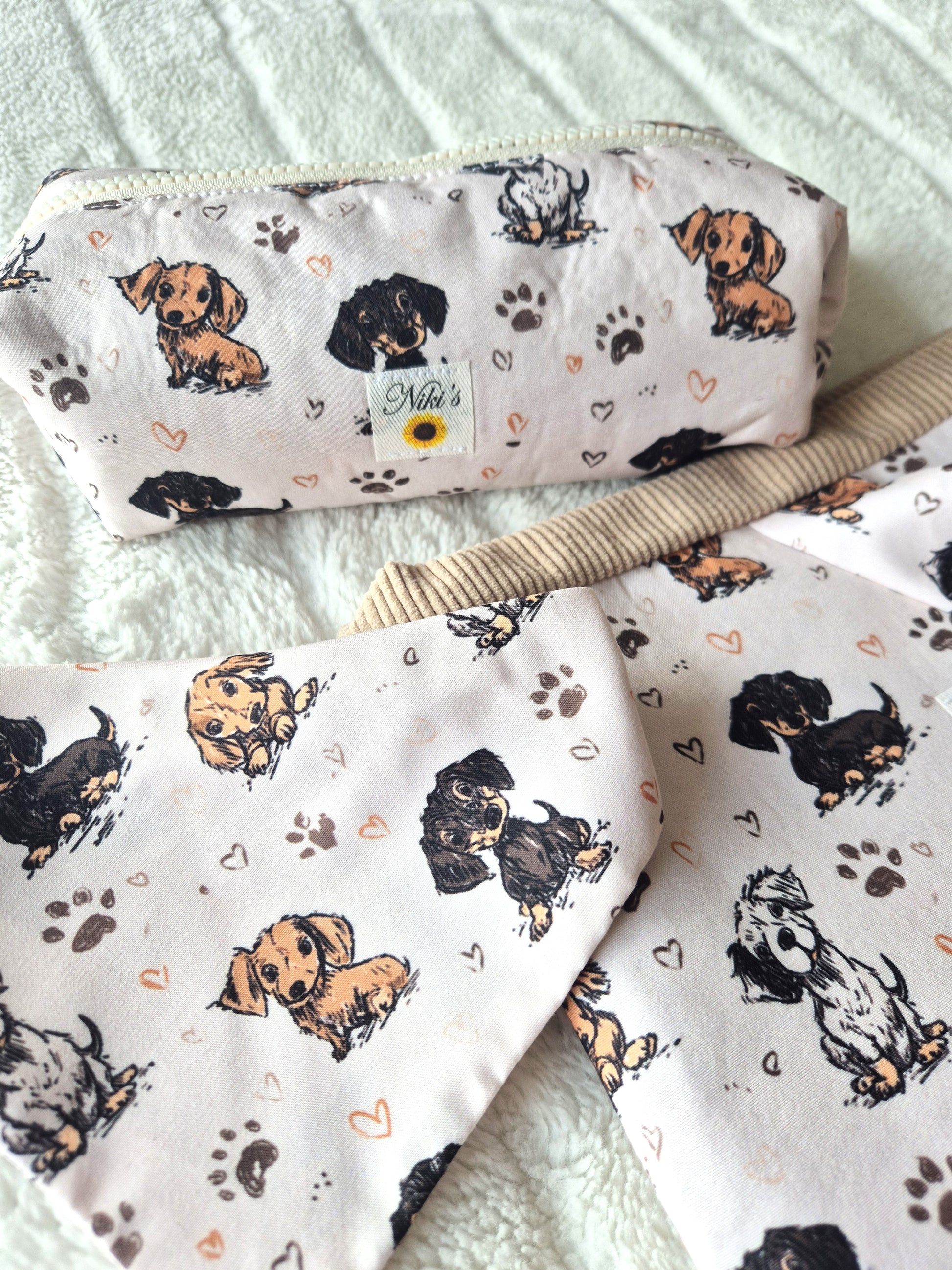 Le combo Teckel Mania, la pochette à livre taille broché, la trousse et le bandana taille S parfait pour lui/ elle!